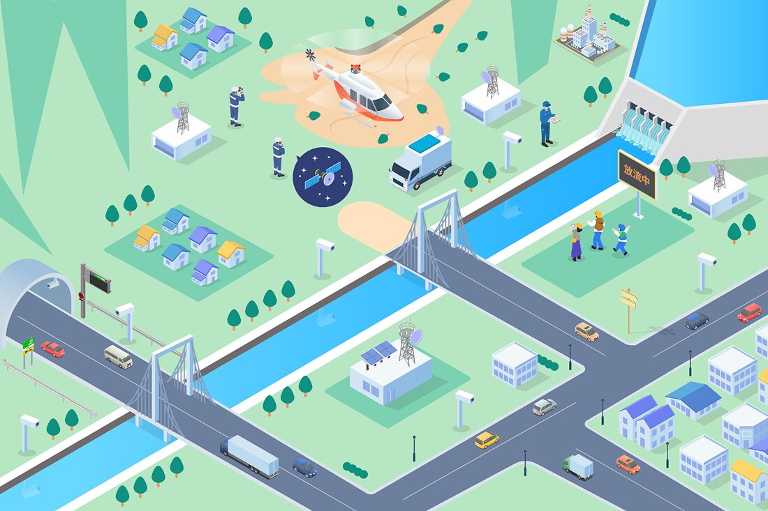 大雨や地震、事故や災害。そんなときも人々が当たり前の毎日を過ごせるよう、ケーネスは河川・道路・災害時の電気・情報・通信を通じて暮らしを守っています。