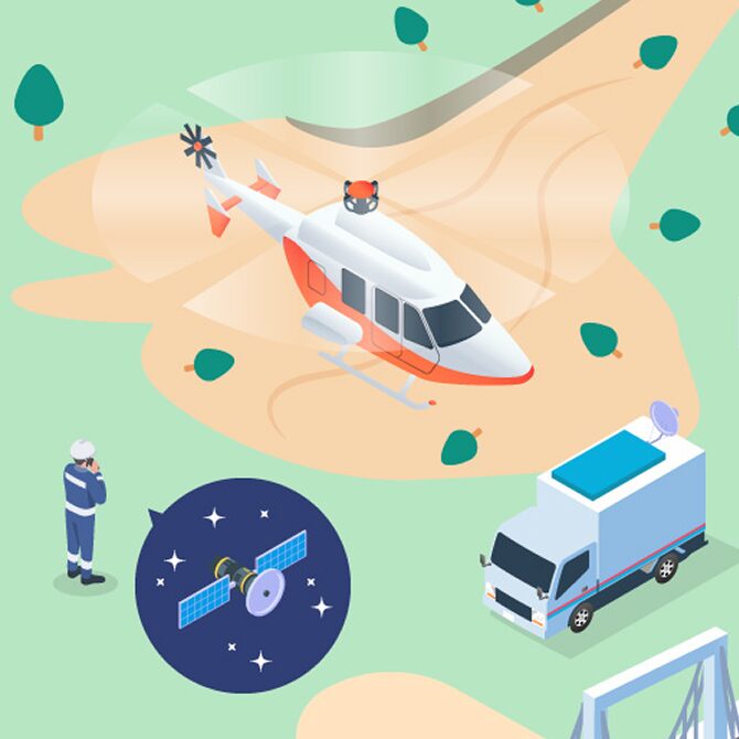 地上の通信回線が使えない被災地でも、衛星を通じて回線を構築。災害現場からの映像や情報を関係機関へ届け、迅速な状況把握や対応を支えています。